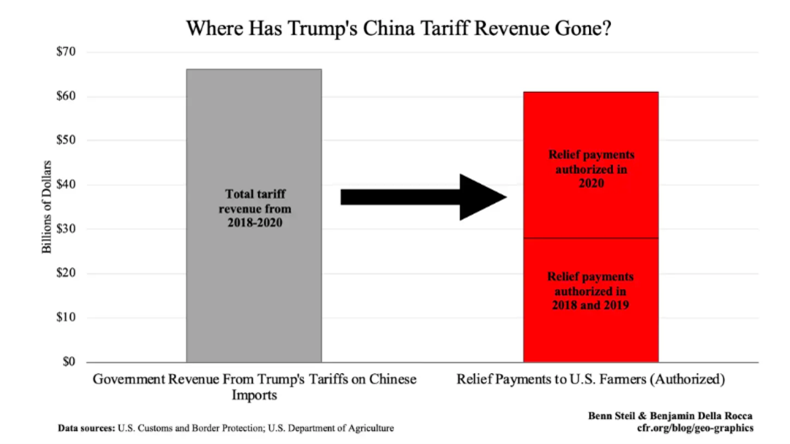 So yes, the United States raised tens of billions of dollars in tariff revenue, but all of this was used to support farmers who were financially harmed by China’s retaliatory tariffs in 2018 and 2019.7