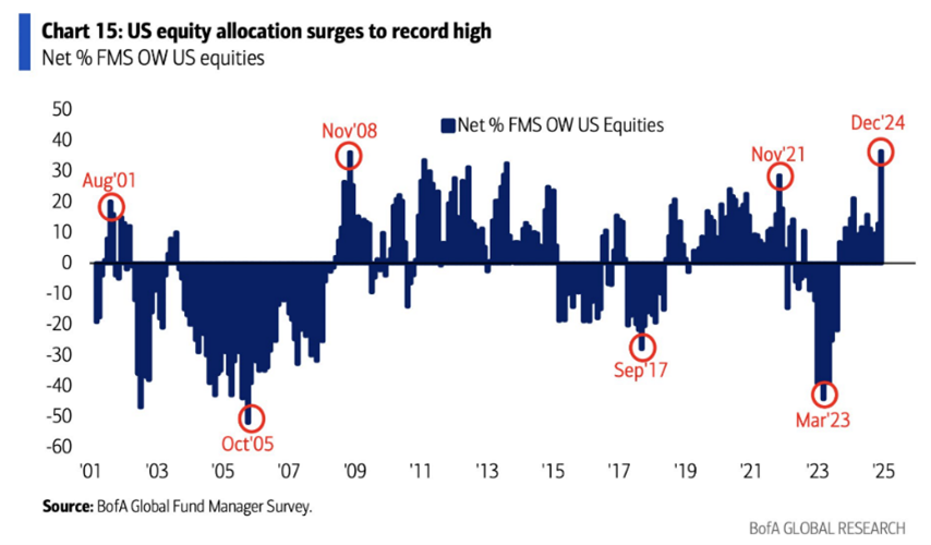 November 2024 witnessed the largest net inflow into U.S. equities ever recorded, as shown below (left) from the Financial Times. Meanwhile institutional investors are the most overweight US equities in the last 25 years (below right), as per Bank of America.
