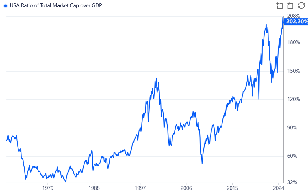 This means that investors in the stock market are paying the highest price relative to economic output, as recorded in history.
