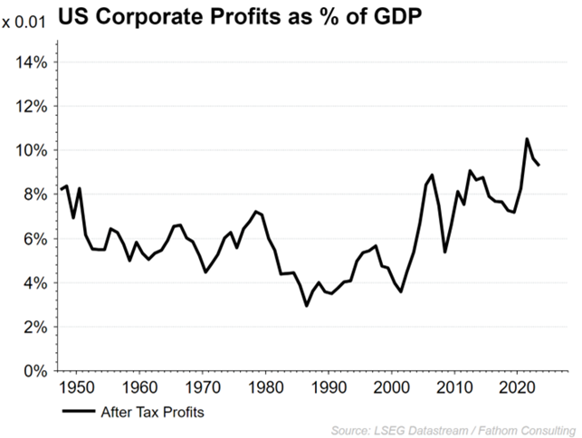 If we zoom out and look at total corporate profits relative to GDP, then we also see profits at a record share of the economy, as per the chart to the left.
