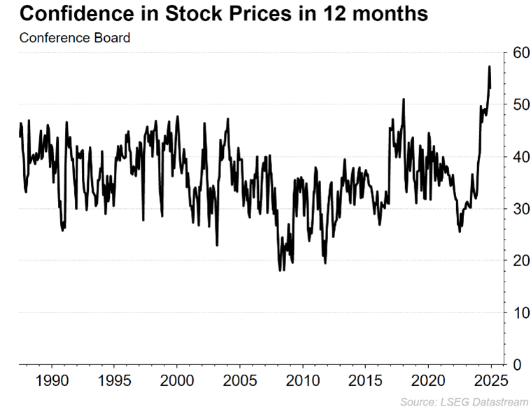 There is further evidence of euphoria from individual investors whose confidence in the stock market reached the highest level on record in November 2024 based on monthly surveys from the Conference Board as shown in the chart to the left.