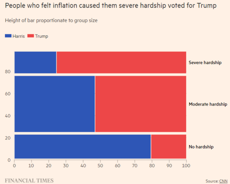 The results are clear: voters who were significantly harmed by inflation supported Trump by a margin of 7-to-1. Trump also won a majority of voters who experienced moderate hardship from inflation.