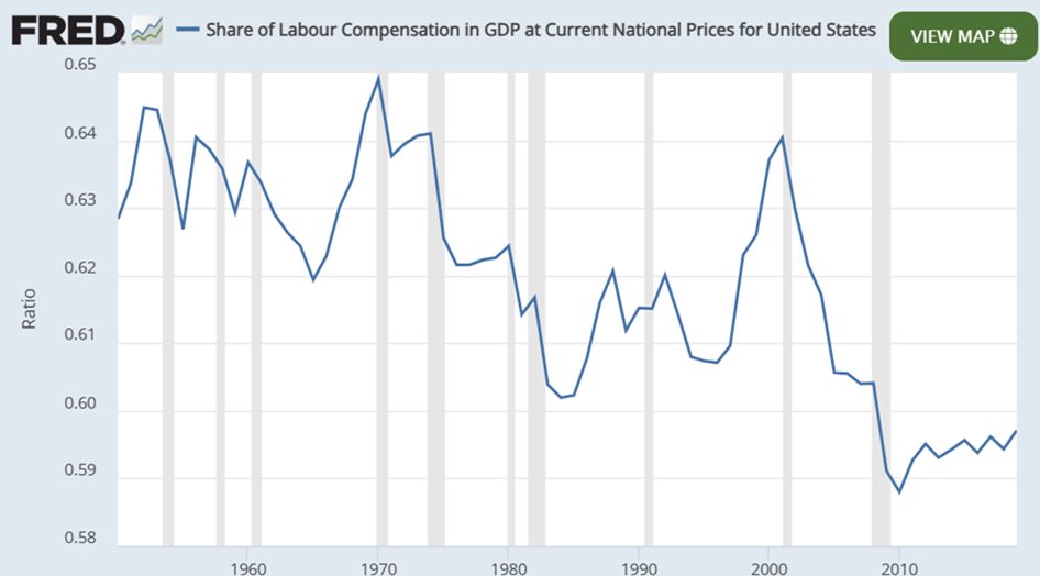 The labour share of GDP remains stuck near the lowest level since World War II, as shown above, and has been around the same level since 2008.