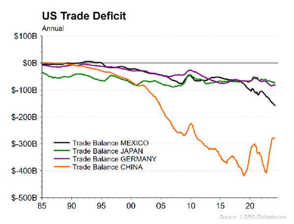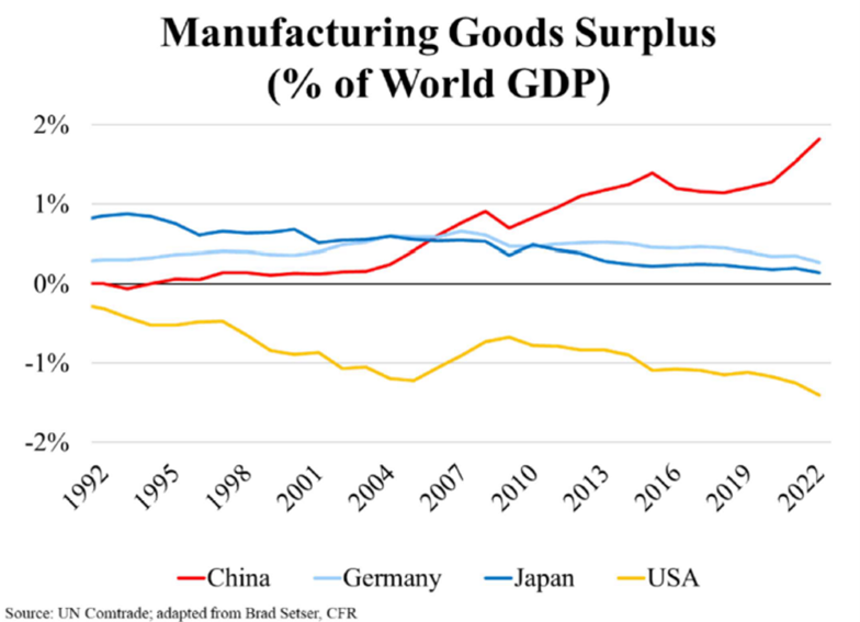The structural trade and financial imbalances that have accrued over the previous few decades have created a very precarious situation for the global economy. As we discussed in our Q2 2024 letter, China has been engaging in predatory trade practices with the West ever since it was allowed to enter the World Trade Organization in 2002.