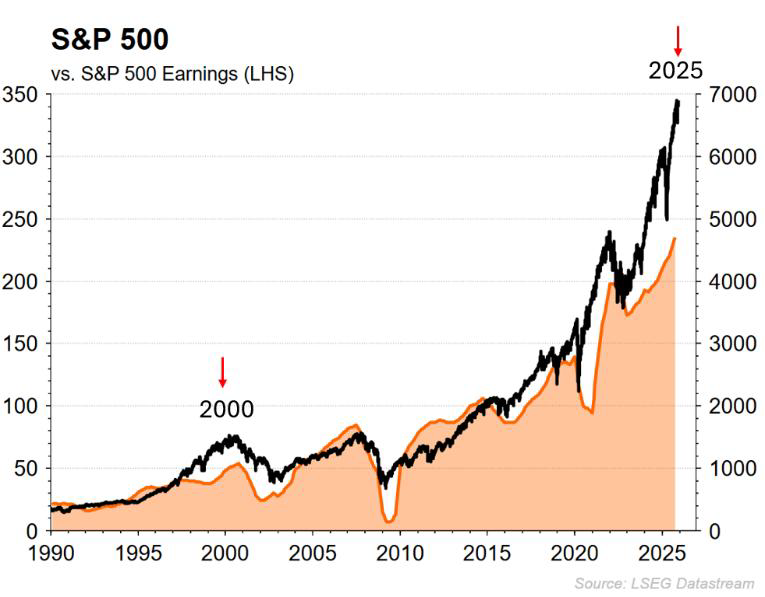 The orange line to the left is the S&P 500 corporate earnings, and the black line is the current S&P 500 level.