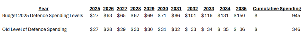 Below is our approximate calculation of what Canadian defence spending might look like over the next decade in billions of dollars: