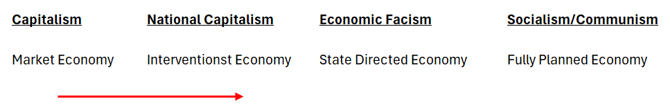 When the government does not control the means of production, as is true in a market economy, it must commandeer the corporate sector to help the government obtain its national economic goals. As this occurs you start moving further away from a market economy. If the transition to National Capitalism is not implemented successfully what follows next can start to look and feel more like National Socialism.